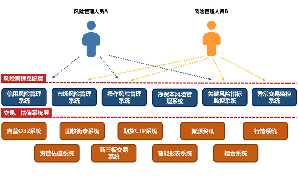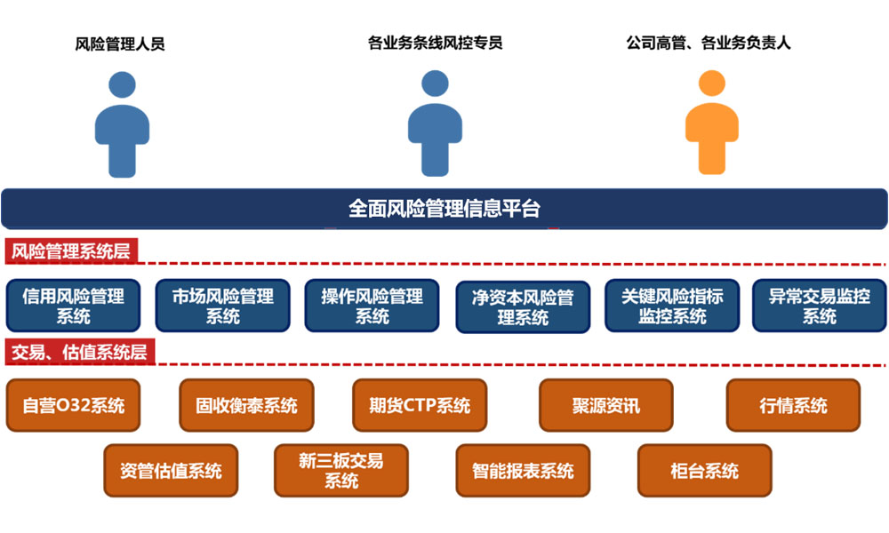 公司在用的风险管理信息系统有净资本风险管理系统、市场风险管理系统、信用风险管理系统、操作风险管理系统、实时风险监控系统等多套系统。从系统数量、系统信息化程度方面来看,存在系统数量较多、系统信息化程度较高、系统间存在数据孤岛及数据壁垒的问题。全面风险管理工作需要同时使用多套系统数据,由于各系统相互独立,数据整合分析只能通过线下的形式展开,这样既大大降低了数据分析效率,又不便于分析结果的系统化落地。