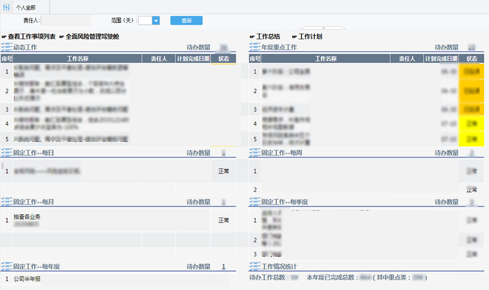 工作台中将工作分为动态工作、固定工作和年度重点工作,根据重要程度又划分为动态一般、动态重点、固定一般和固定重点。其中固定工作的频率划分为日、周、月、季度和年度,工作台可根据对应频率自动生成工作任务,防止固定工作被遗漏。工作台还具有任务派发,自动生成工作总结、工作计划的功能。风险管理人员将所有工作内容录入工作台中,其记录的工作量将为员工考核提供依据。
