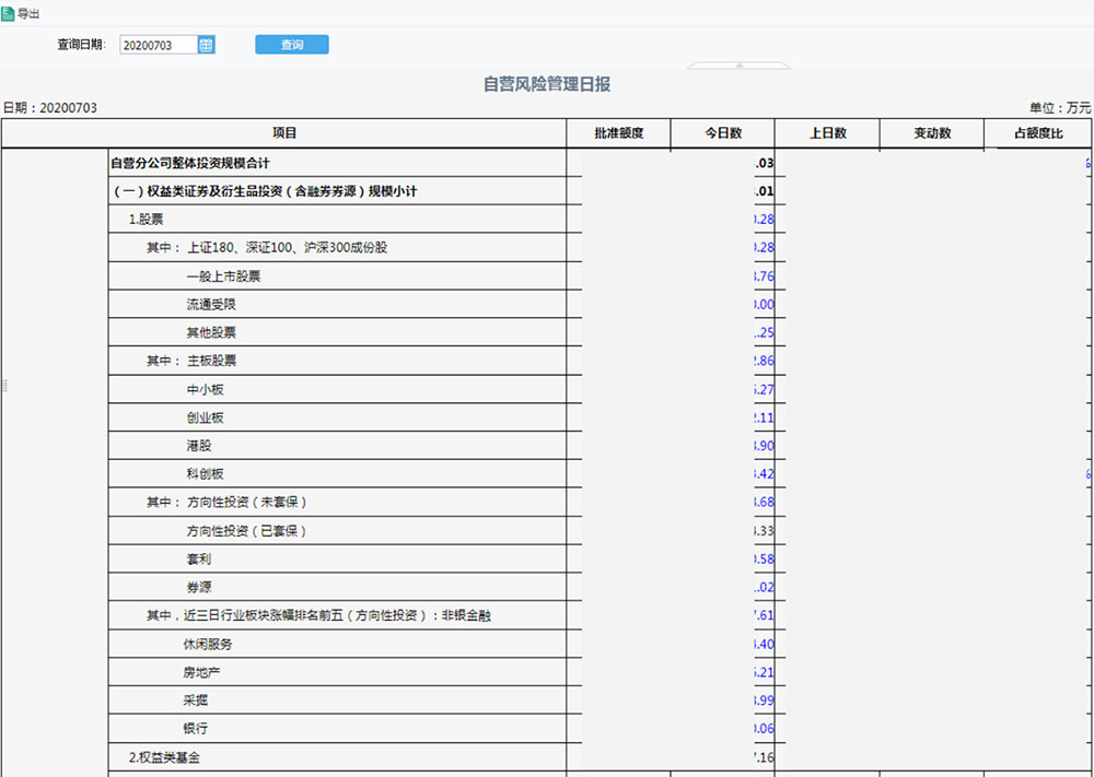 自营风险管理日报中包含了100多个风险监控指标,每一个指标计算方式都不同,其中今日数可以通过点击后进入详细信息页面。此功能是原有手工日报无法比拟的,也为公司管理决策层,以及风险管理人员提供了风险管理的极大便利。