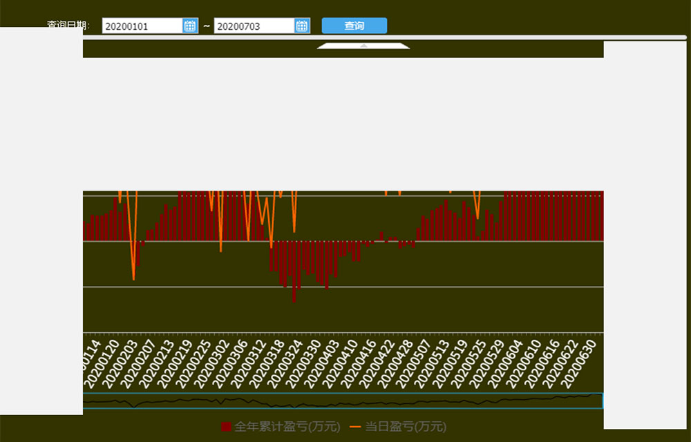 通过平台的强大的数据计算能力和图表显示能力,绘制了本年累计盈亏/沪深300走势图、当日盈亏/VaR金额走势图。两个走势图分别展示了本年累计盈亏和沪深300走势的相关性情况、当日盈亏突破VaR金额情况。