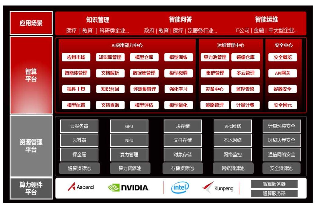 通过超融合基座将多台通用算力服务器的计算资源、存储资源和网络资源进行抽象、池化和自动化处理,从而整合成统一的资源池,进行统一管理、监控和服务,实现基础设施的横向扩展,支持国内外主流CPU、GPU、NPU作为智算基础环境,发布了多款智算一体机型号,最高性能智算一体机应用推理情况下,可部署DeepSeek R1 671B模型。