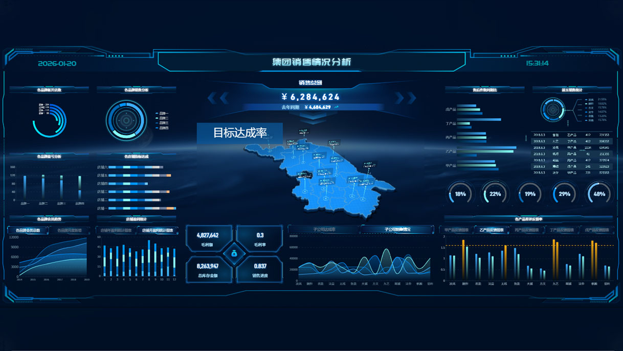 适用于企业销售和市场分析部门,用于展示和分析集团的销售业绩、产品销售分布、区域销售情况、客户购买偏好等关键数据,帮助企业洞察市场动态,优化销售策略,提升运营效率。