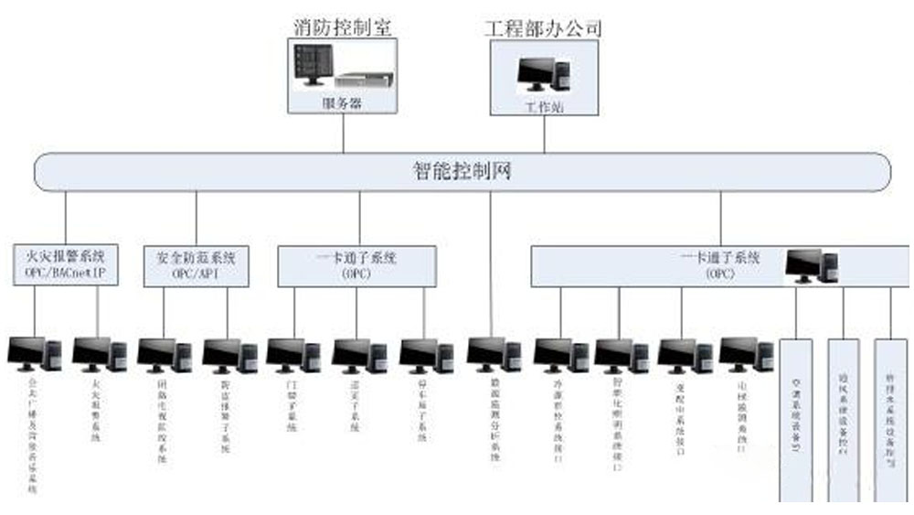 为了实现信息综合管理和资源共享,提高管理效率和综合服务能力,更充分发挥在突发事件时对全局事件的控制和处理能力,将灾害的损失减少到最低限度,降低运行成本,达到运营与客户服务管理、维护管理、物业管理智能化的目的,为使用者创造一个安全、高效、舒适、便利的工作环境。根据公寓项目的实际情况,需要将多个弱电子系统,包括建筑设备监控系统、火灾报警系统、闭路电视、监控系统、防盗报警系统、门禁系统、停车场系统、公共广播及背景音乐系统、巡更系统等集中在一个集成平台上进行集中监控和管理,服务器设置于一层消防监控中心,在工程部设置分工作站。